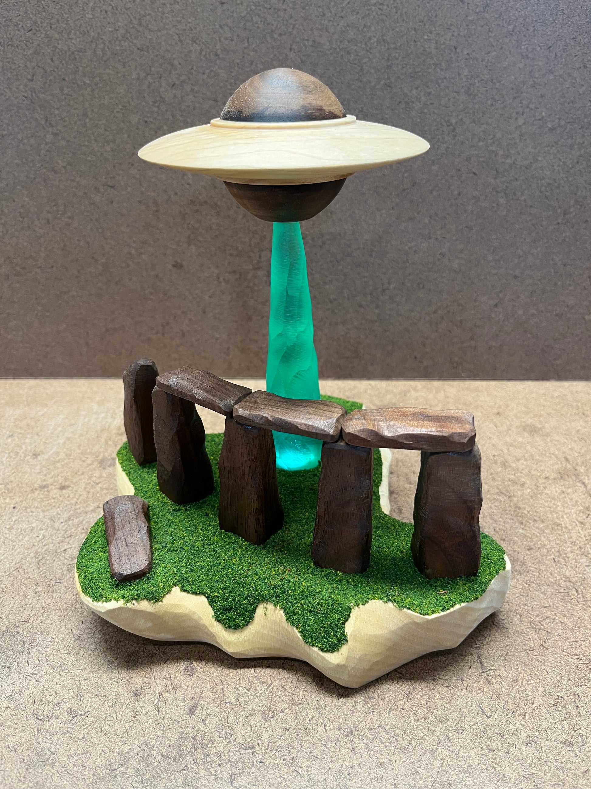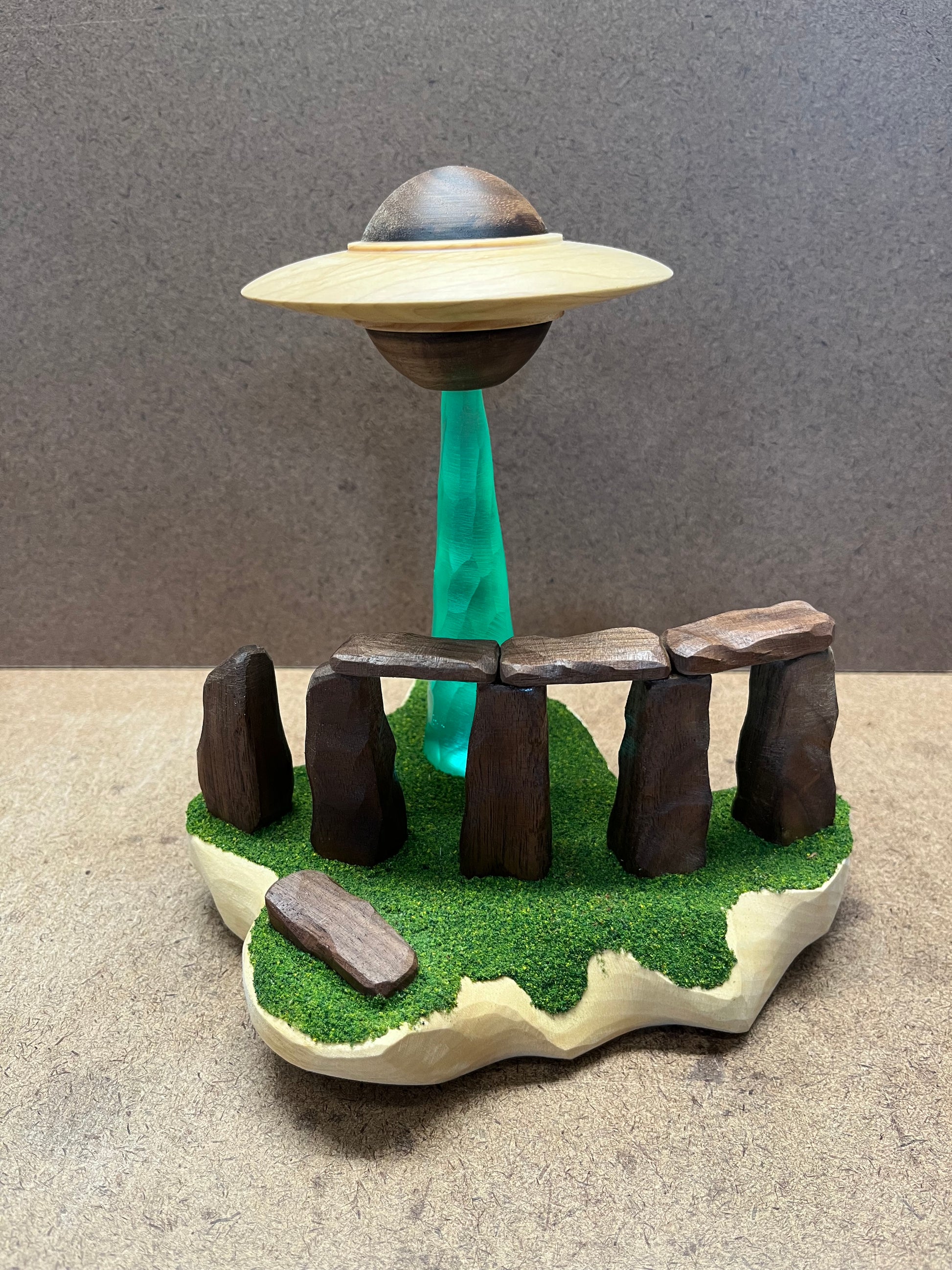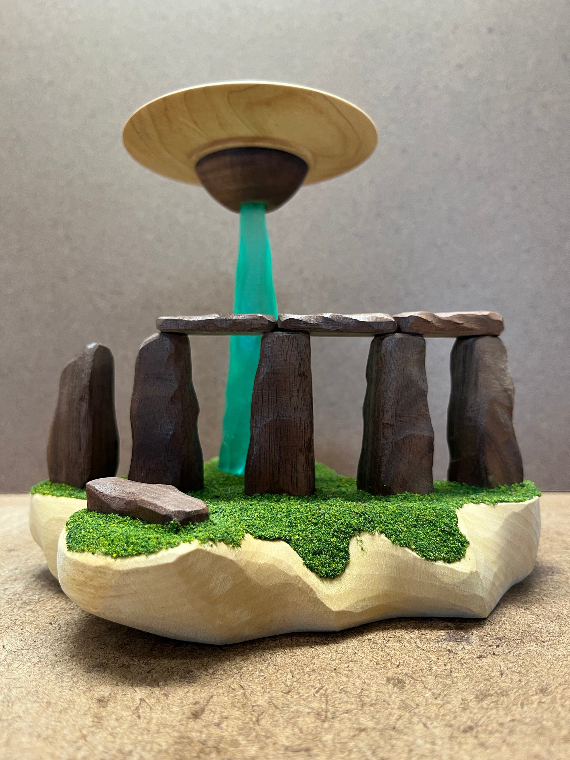 This UFO has a unique “top and bottom” cockpit design where the wing is made from Maple and is between two Walnut domes. The craft is hovering while beaming down a textured green conical light (BATTERIES INCLUDED). The light is hitting the ground behind Stonehenge with its mysterious stone structures having been carved from Walnut.