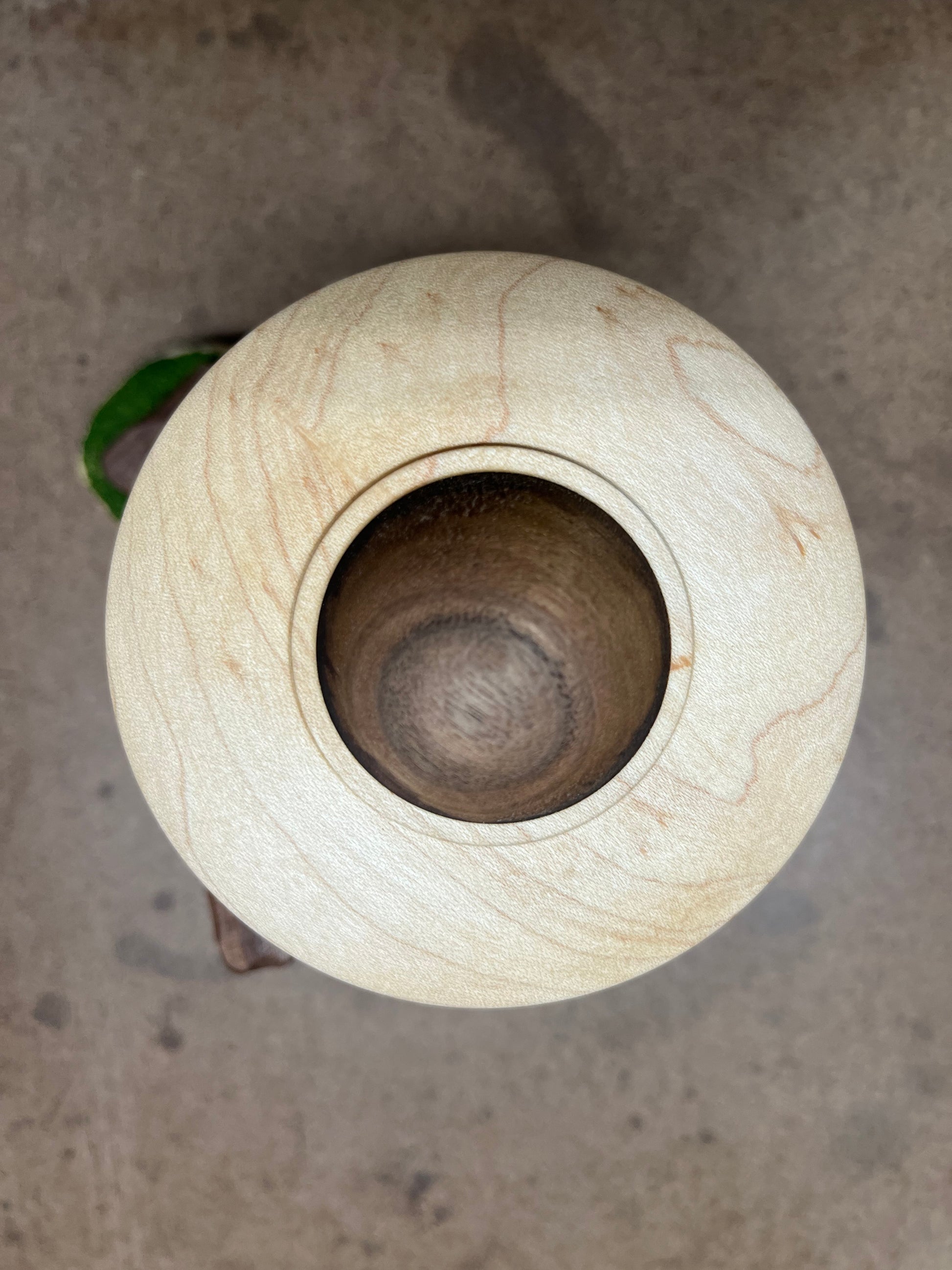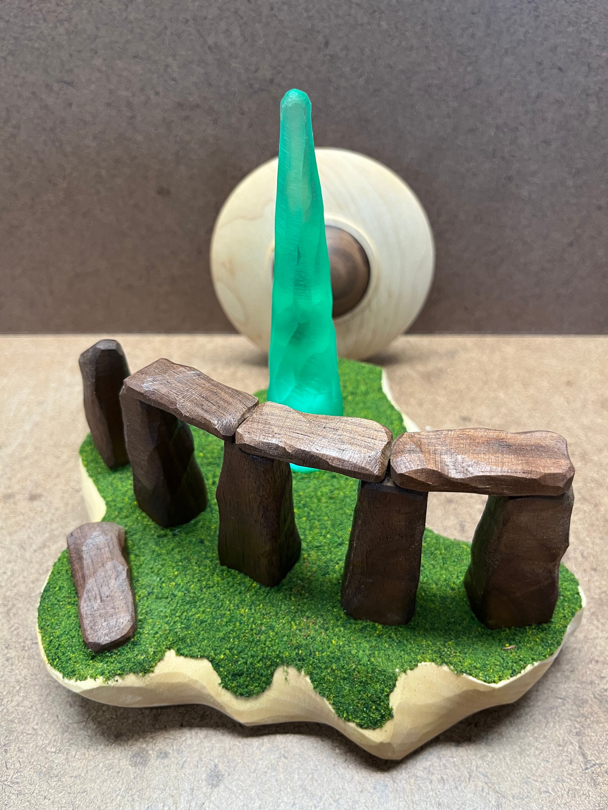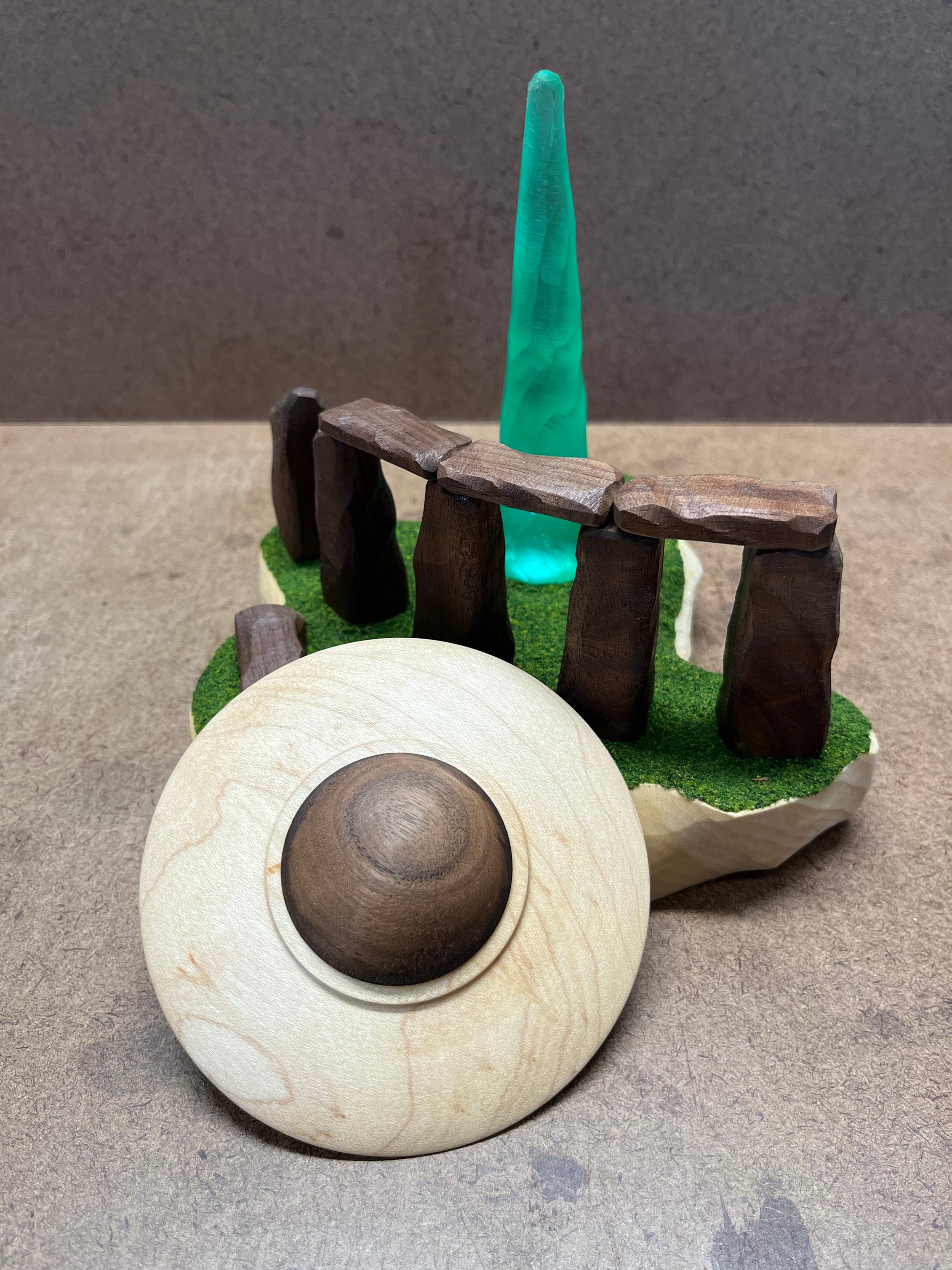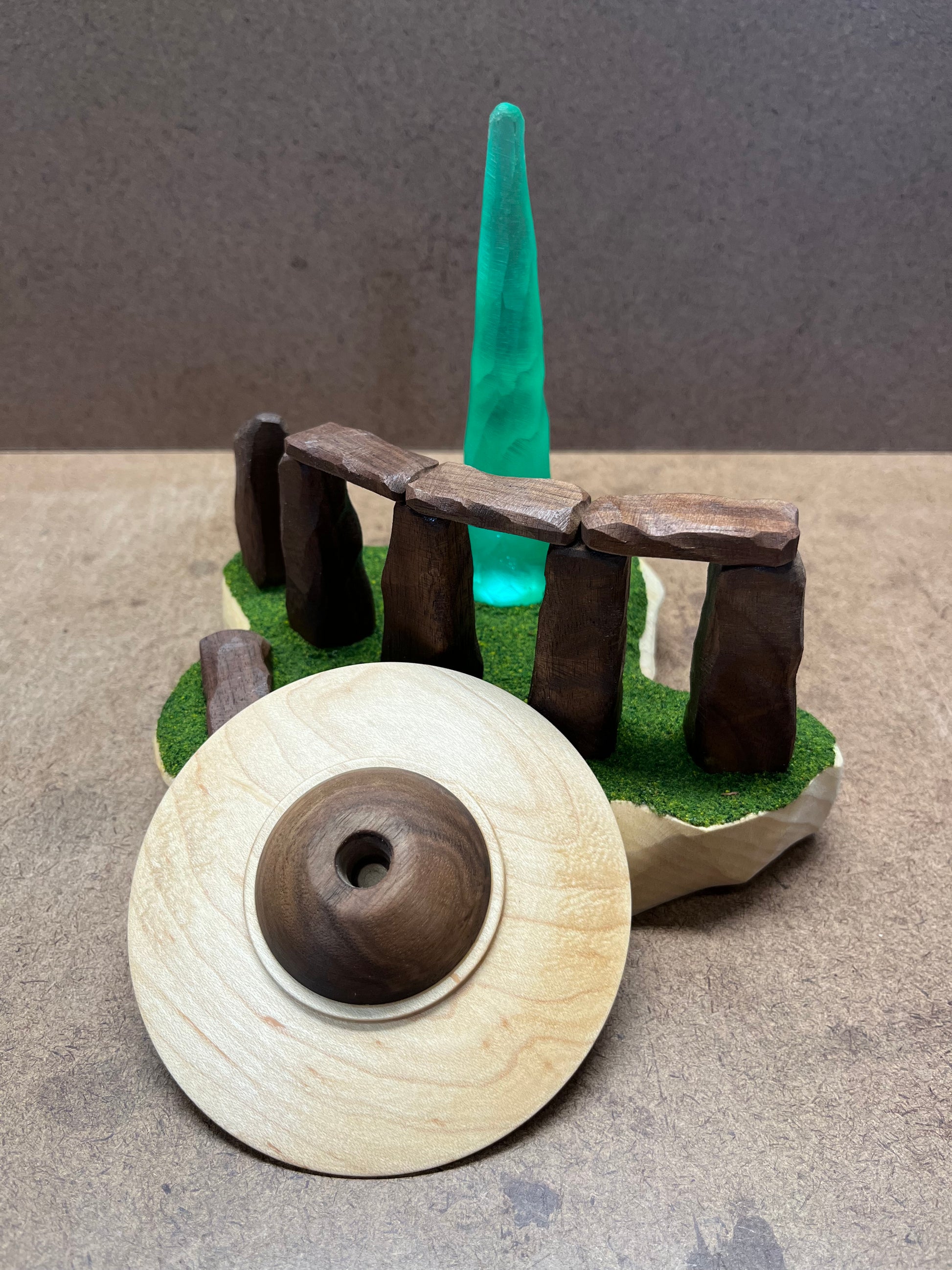 This UFO has a unique “top and bottom” cockpit design where the wing is made from Maple and is between two Walnut domes. The craft is hovering while beaming down a textured green conical light (BATTERIES INCLUDED). The light is hitting the ground behind Stonehenge with its mysterious stone structures having been carved from Walnut.